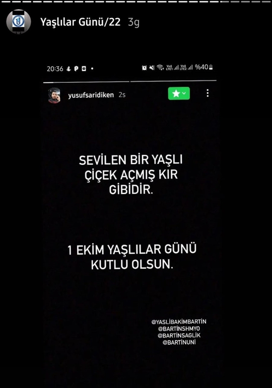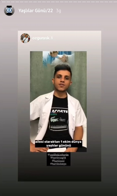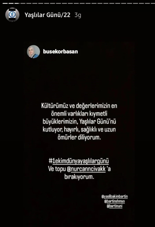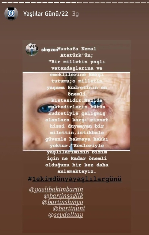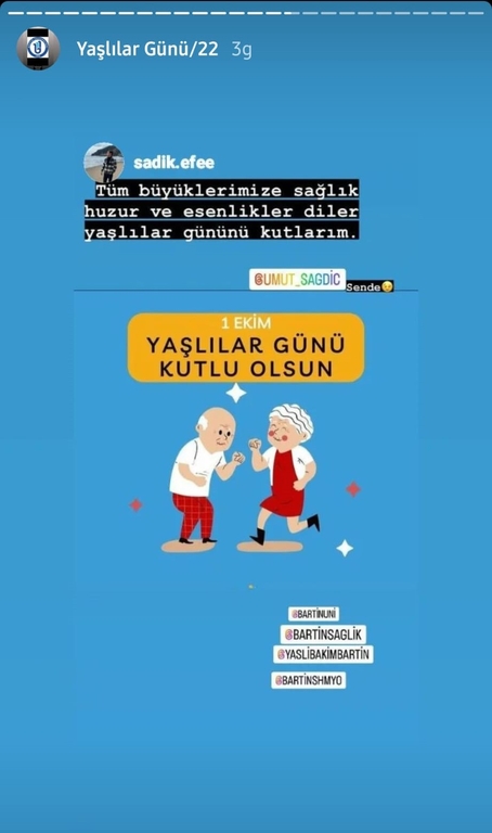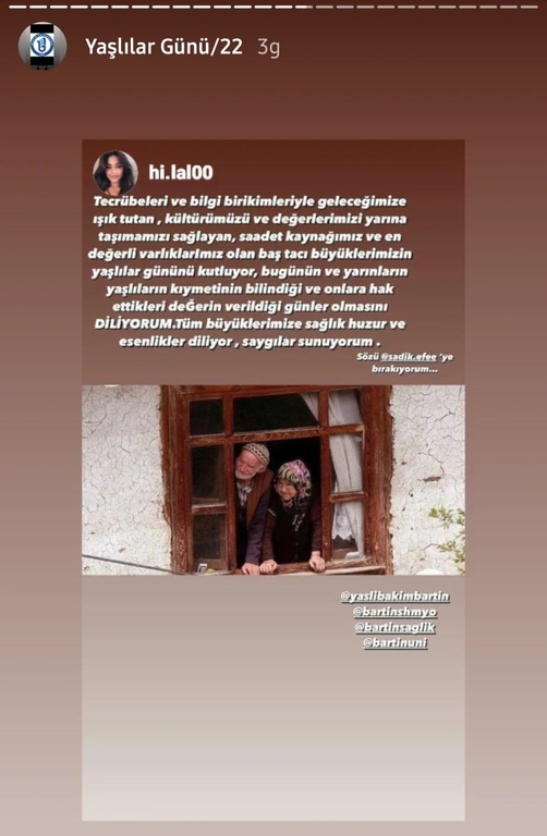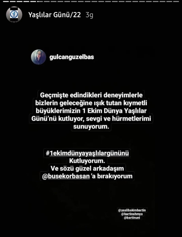 Bartın Üniversitesi Sağlık Bilimleri Fakültesi ve Sağlık Hizmetleri Meslek Yüksekokulu Yaşlı Bakım Programı'nın gerçekleştirdiği etkinlikte "1 Ekim Dünya Yaşlılar Günü" sevgili öğrencilerin ve değerli misafir katılımcıların desteğiyle kutlandı.