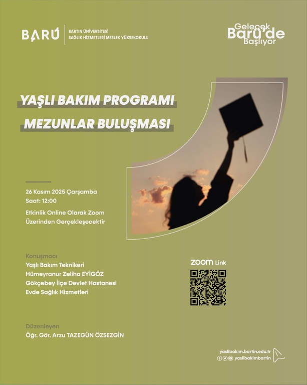 Programımızdan mezun öğrencilerimiz ile 26 Kasım 2025 Çarşamba günü çevrimiçi olarak "Zoom uygulaması" üzerinden mezun ve öğrencilerimize yönelik etkinlik yapılacaktır. Tüm değerli mezunlarımız ve öğrencilerimiz davetlidir. İlgili toplantıya görseldeki bilgilerden ulaşabilirsiniz.Etkinlik Adı: Mezunlar Buluşması