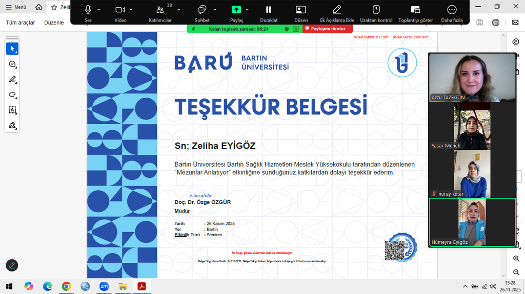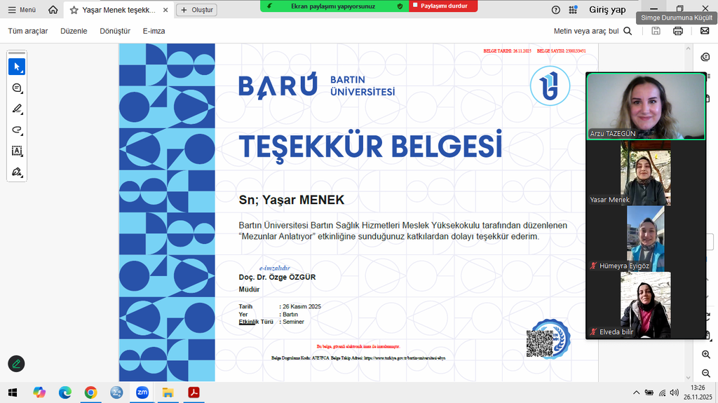 Bartın Üniversitesi Kariyer Uygulama ve Araştırma Merkezi koordinasyonunda, Sağlık Hizmetleri Meslek Yüksekokulu Yaşlı Bakımı Programı tarafından 26 Kasım 2025 tarihinde iki oturumdan oluşan bir etkinlik gerçekleştirilmiştir. Saat 12.00’de “Mezunlar Buluşması”, saat 13.00’te ise “Mezunlar Anlatıyor” başlıklı program Öğr. Gör. Arzu Tazegün Özsezgin’in koordinatörlüğünde düzenlenmiştir.